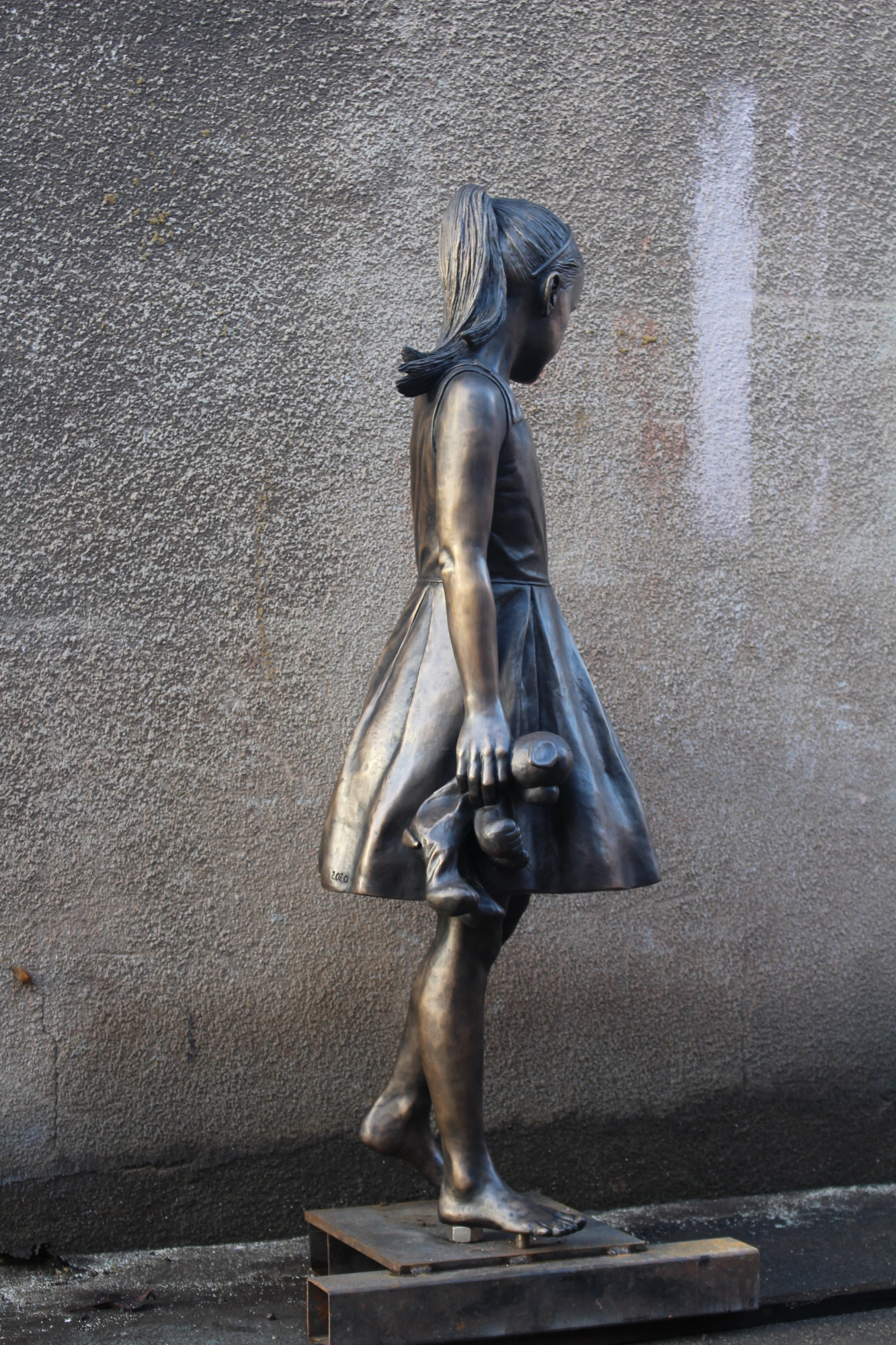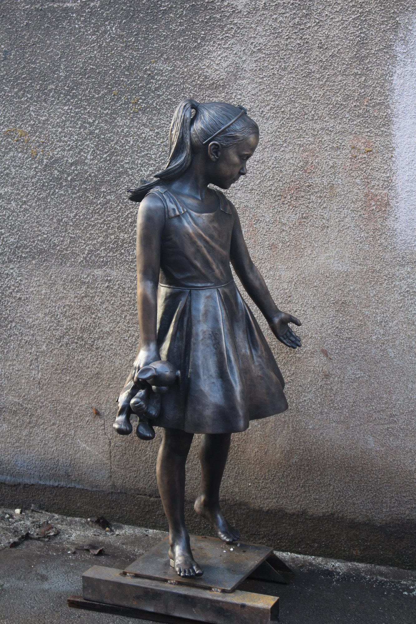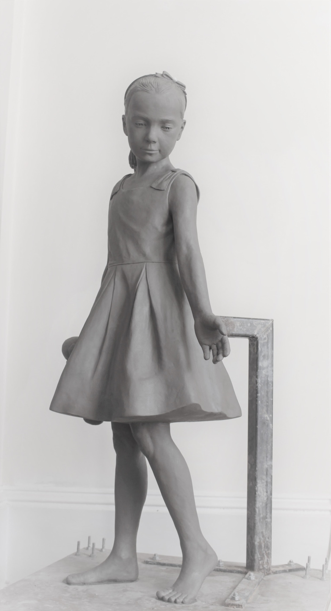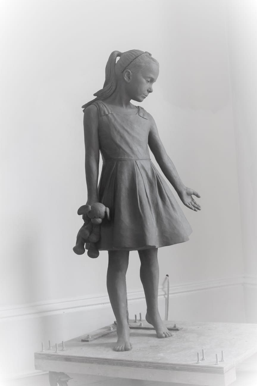 This life size bronze sculpture was commissioned by a family to capture their daughter at a particular stage of life. She has been designed to be installed in a meadow setting so that her hand gently touches the wild flowers. In her other hand she holds her favourite toy.