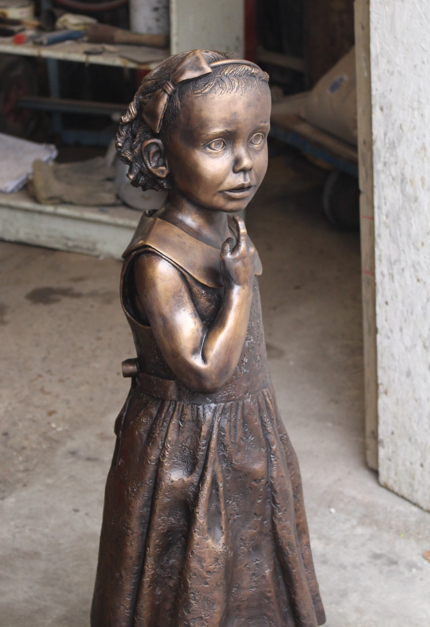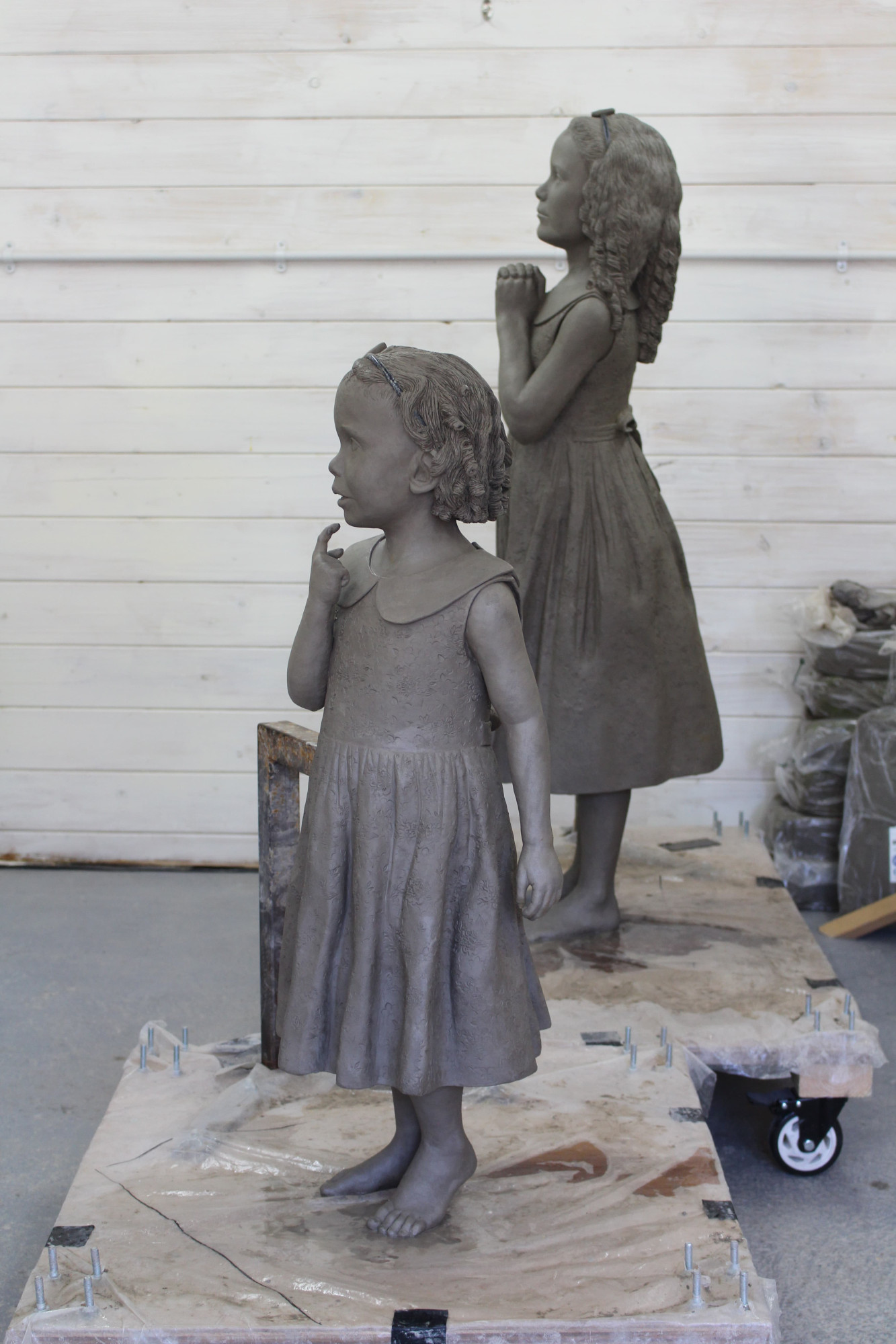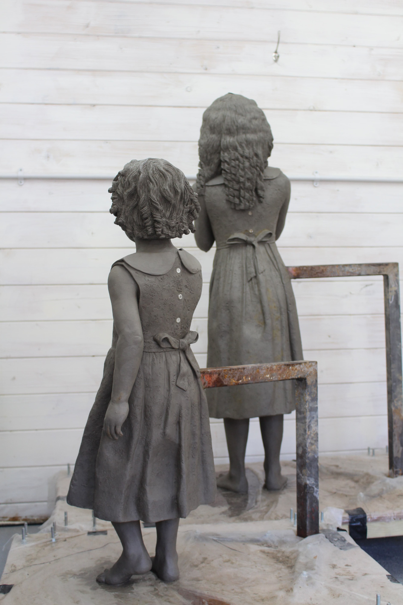 These two life size sculptures of two sisters were commissioned by the girls' family. The finished bronze sculptures were mounted on black granite plinths and show them wearing their summer dresses and characteristic headbands.